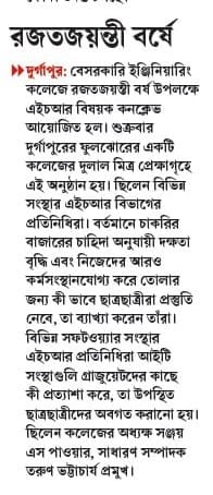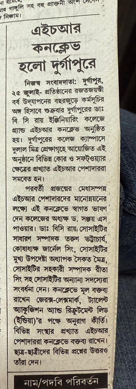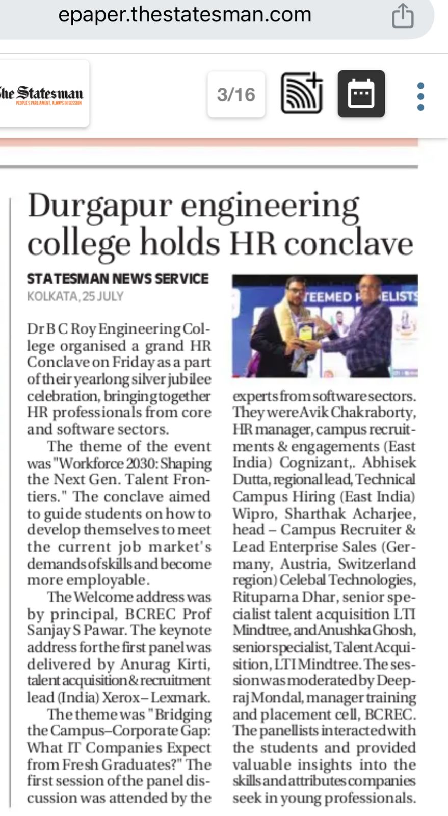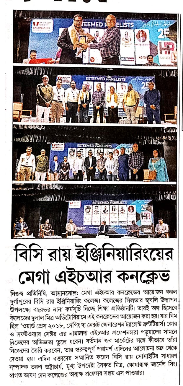 Dr. B. C. Roy Engineering College organized a grand HR Conclave on 25th July, 2025 as a part of their yearlong Silver Jubilee celebration at the Dulal Mitra Auditorium bringing together famous HR professionals from core and software sectors. The theme of the event was "Workforce 2030: Shaping the Next Gen. Talent Frontiers." The conclave aimed to guide students on how to develop themselves to meet the current job market's demands of skills and become more employable.