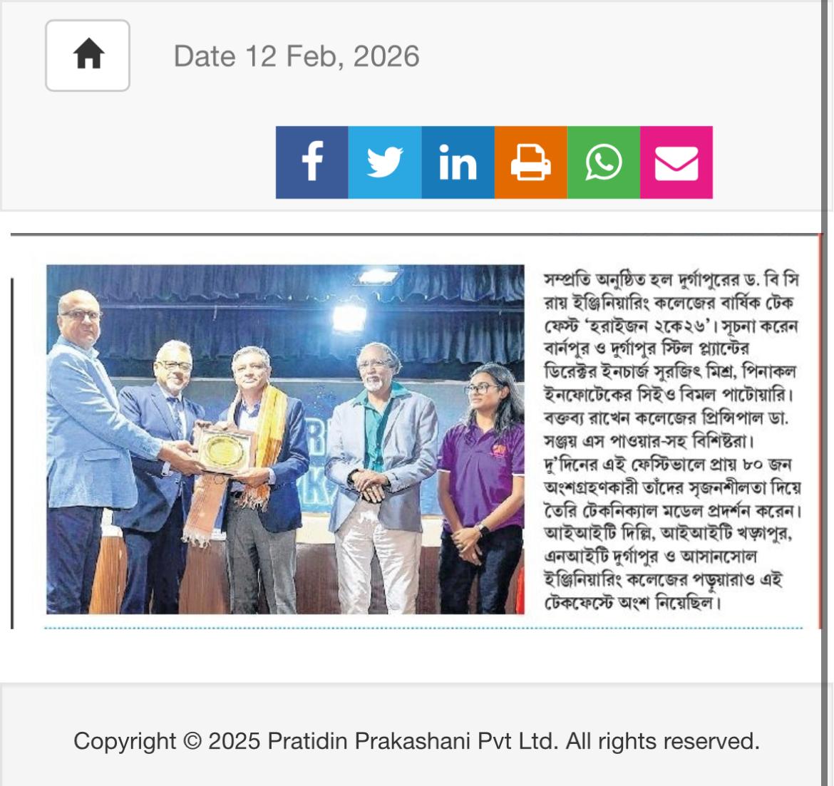 The welcome address was delivered by Dr. Sanjay S. Pawar, Principal, Dr. B. C. Roy Engineering College. This was followed by an inspiring address by Dr. Satyajit Bose, President, Dr. B. C. Roy Engineering College (Society), highlighting the importance of innovation, technical excellence and industry–academia collaboration.