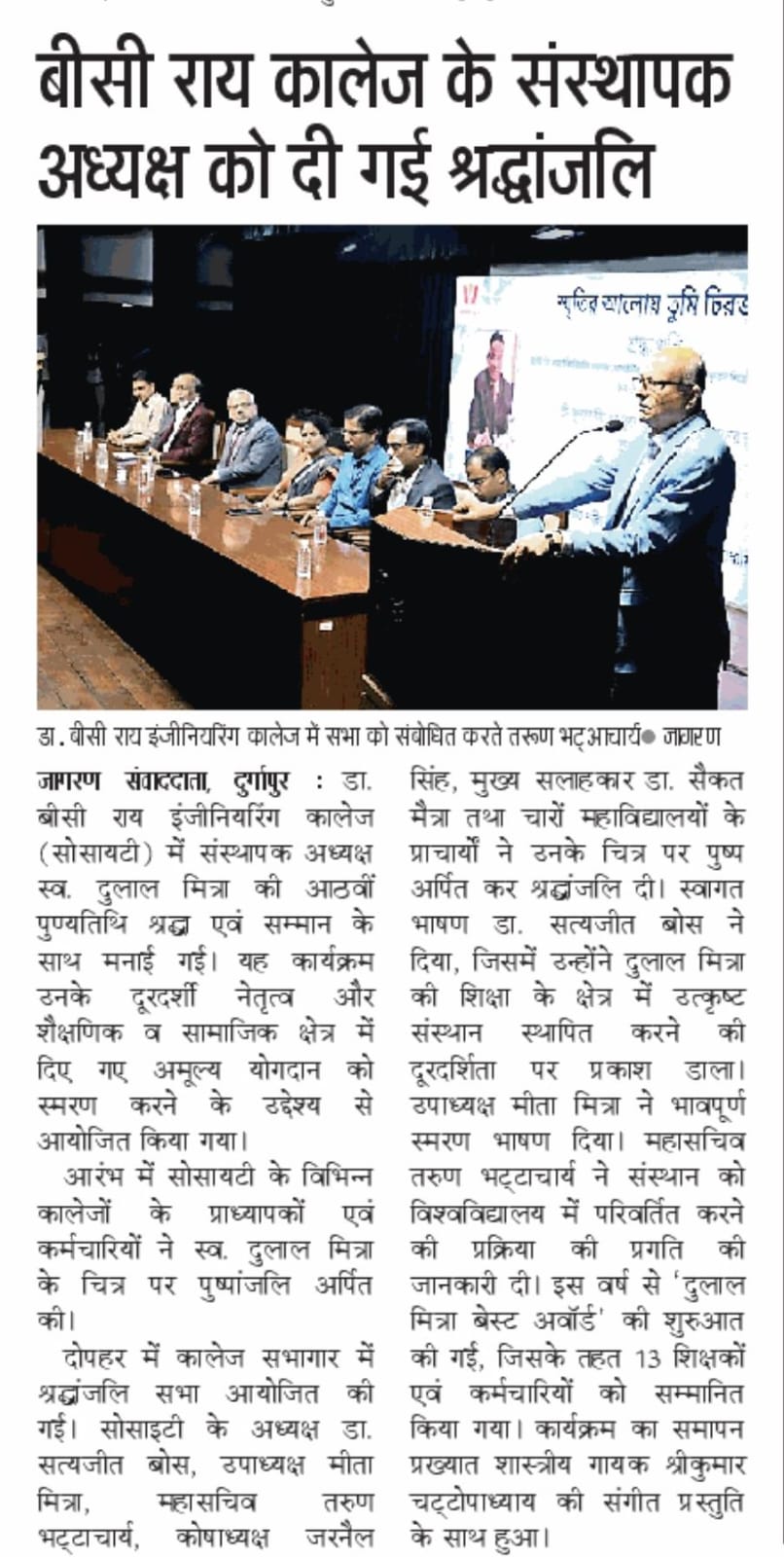 Shri Dulal Mitra Memorial Lecture was delivered by Mr. Tarun Bhattacharya, General Secretary, Dr. B. C. Roy Engineering College (Society), who emphasized the vision of Dulal Mitra and asked all faculty and staff members to dedicate themselves more for the sake of the institutions and their students. He also mentioned that Shri Dulal Mitra's vision was being advanced with the initiative of the Society to transform BCREC into a state university which is now in an advanced stage.